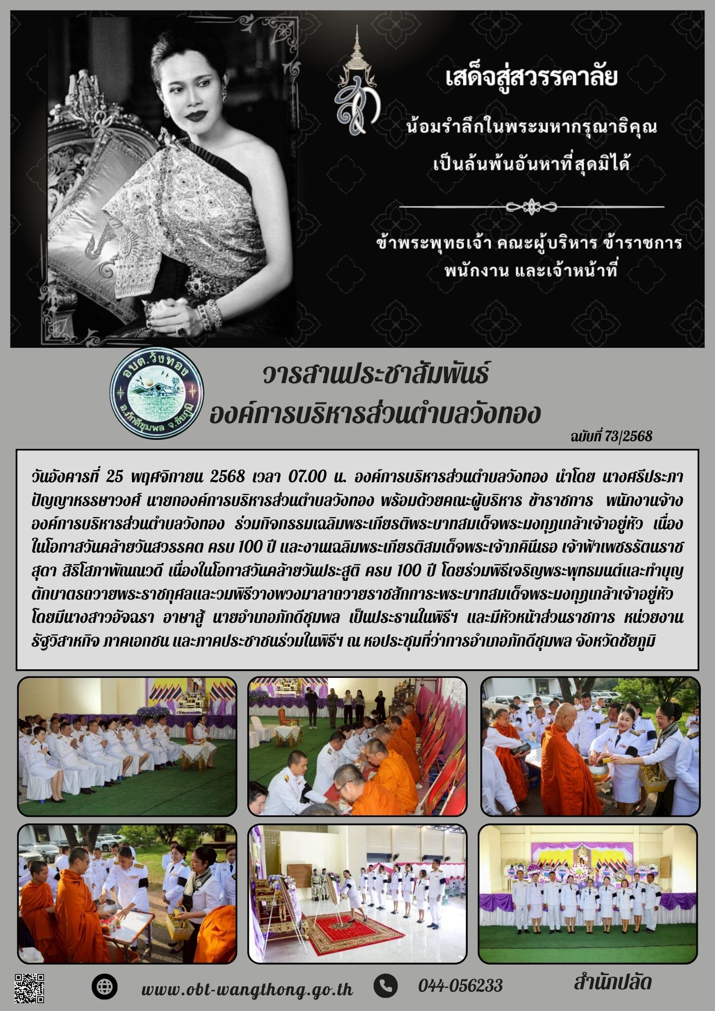 วันอังคารที่ 25 พฤศจิกายน 2568 เวลา 07.00 น. องค์การบริหารส่วนตำบลวังทอง นำโดย นางศรีประภา ปัญญาหรรษาวงศ์ นายกองค์การบริหารส่วนตำบลวังทอง พร้อมด้วยคณะผู้บริหาร ข้าราชการ พนักงานจ้างองค์การบริหารส่วนต