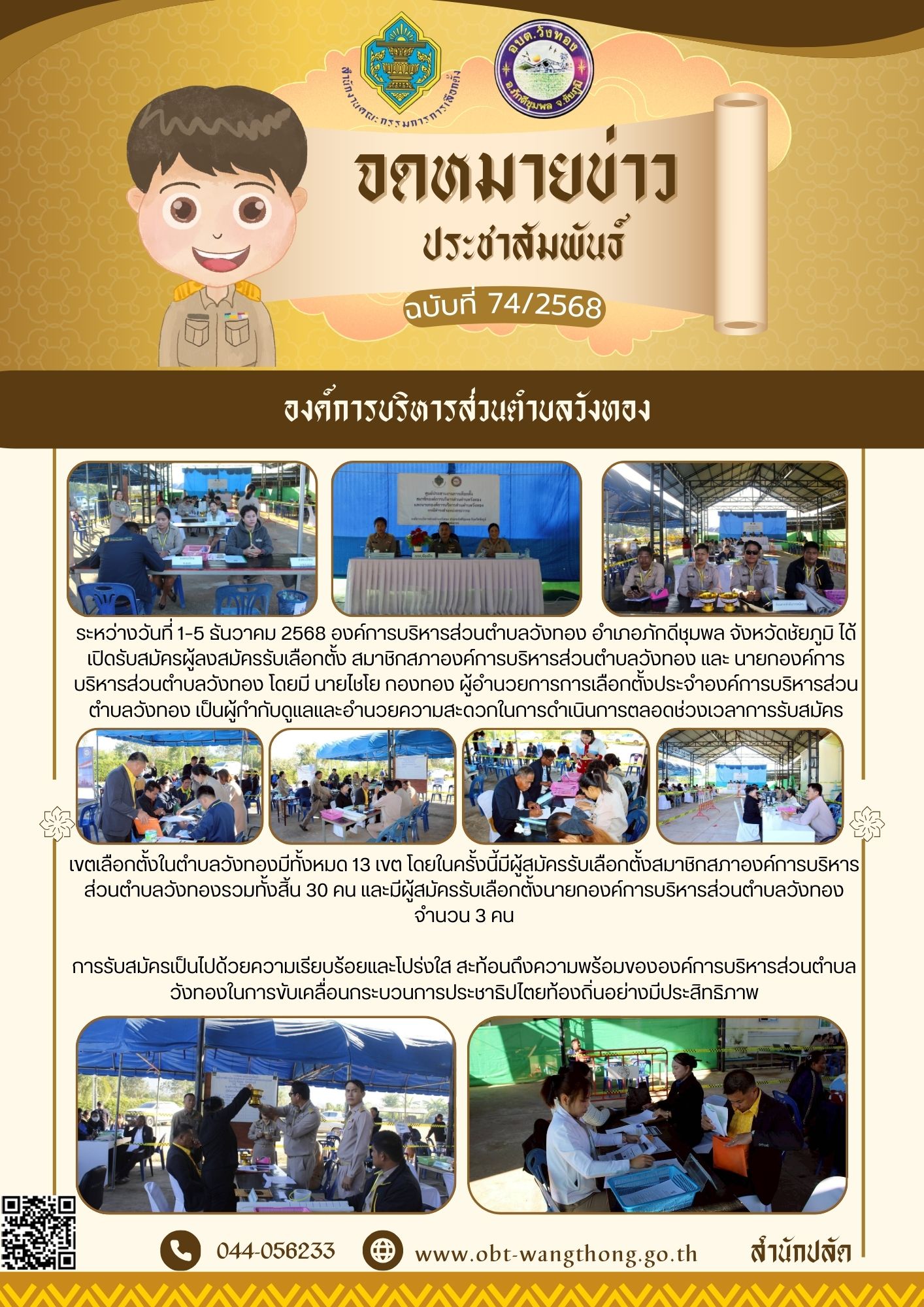 ระหว่างวันที่ 15 ธันวาคม 2568 องค์การบริหารส่วนตำบลวังทอง อำเภอภักดีชุมพล จังหวัดชัยภูมิ ได้เปิดรับสมัครผู้ลงสมัครรับเลือกตั้ง สมาชิกสภาองค์การบริหารส่วนตำบลวังทอง และ นายกองค์การบริหารส่วนตำบลวังทอง