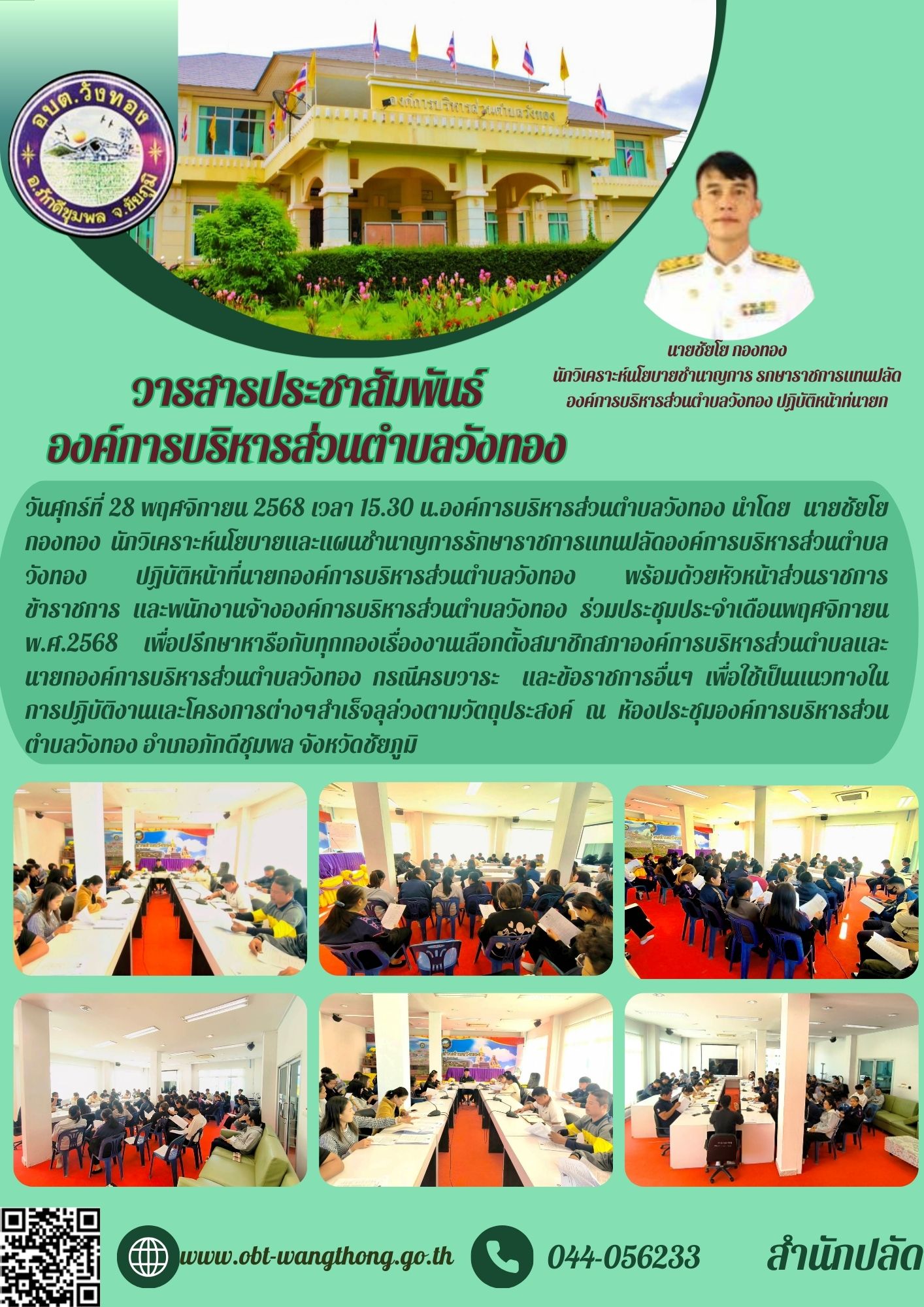วันศุกร์ที่ 28 พฤศจิกายน 2568 เวลา 15.30 น.องค์การบริหารส่วนตำบลวังทอง นำโดย นายชัยโย กองทอง นักวิเคราะห์นโยบายและแผนชำนาญการรักษาราชการแทนปลัดองค์การบริหารส่วนตำบลวังทอง ปฏิบัติหน้าที่นายกองค์การบริ