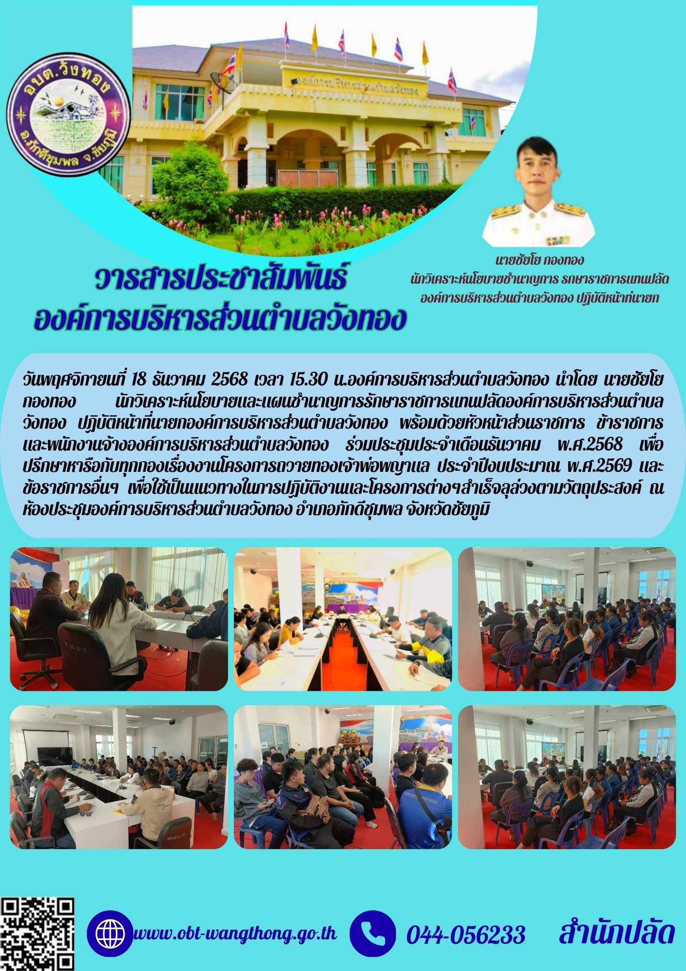 วันพฤศจิกายนที่ 18 ธันวาคม 2568 เวลา 15.30 น.องค์การบริหารส่วนตำบลวังทอง นำโดย นายชัยโย กองทอง นักวิเคราะห์นโยบายและแผนชำนาญการรักษาราชการแทนปลัดองค์การบริหารส่วนตำบลวังทอง ปฏิบัติหน้าที่นายกองค์การบร