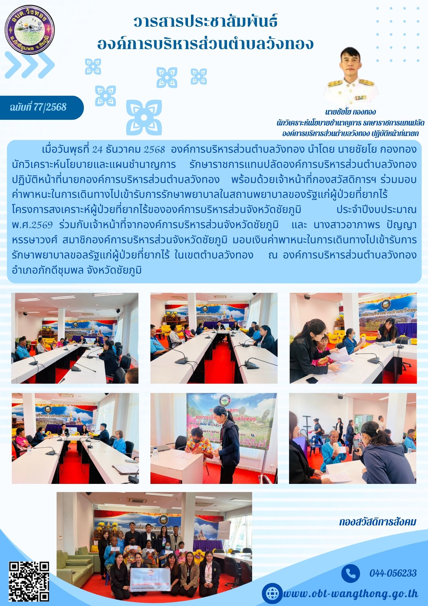 วันอังคารที่ 23 ธันวาคม 2568 องค์การบริหารส่วนตำบลวังทอง นำโดย นายชัยโย กองทอง นักวิเคราะห์นโยบายและแผนชำนาญการ รักษาราชการแทนปลัดองค์การบริหารส่วนตำบลวังทอง ปฏิบัติหน้าที่นายกองค์การบริหารส่วนตำบลวั