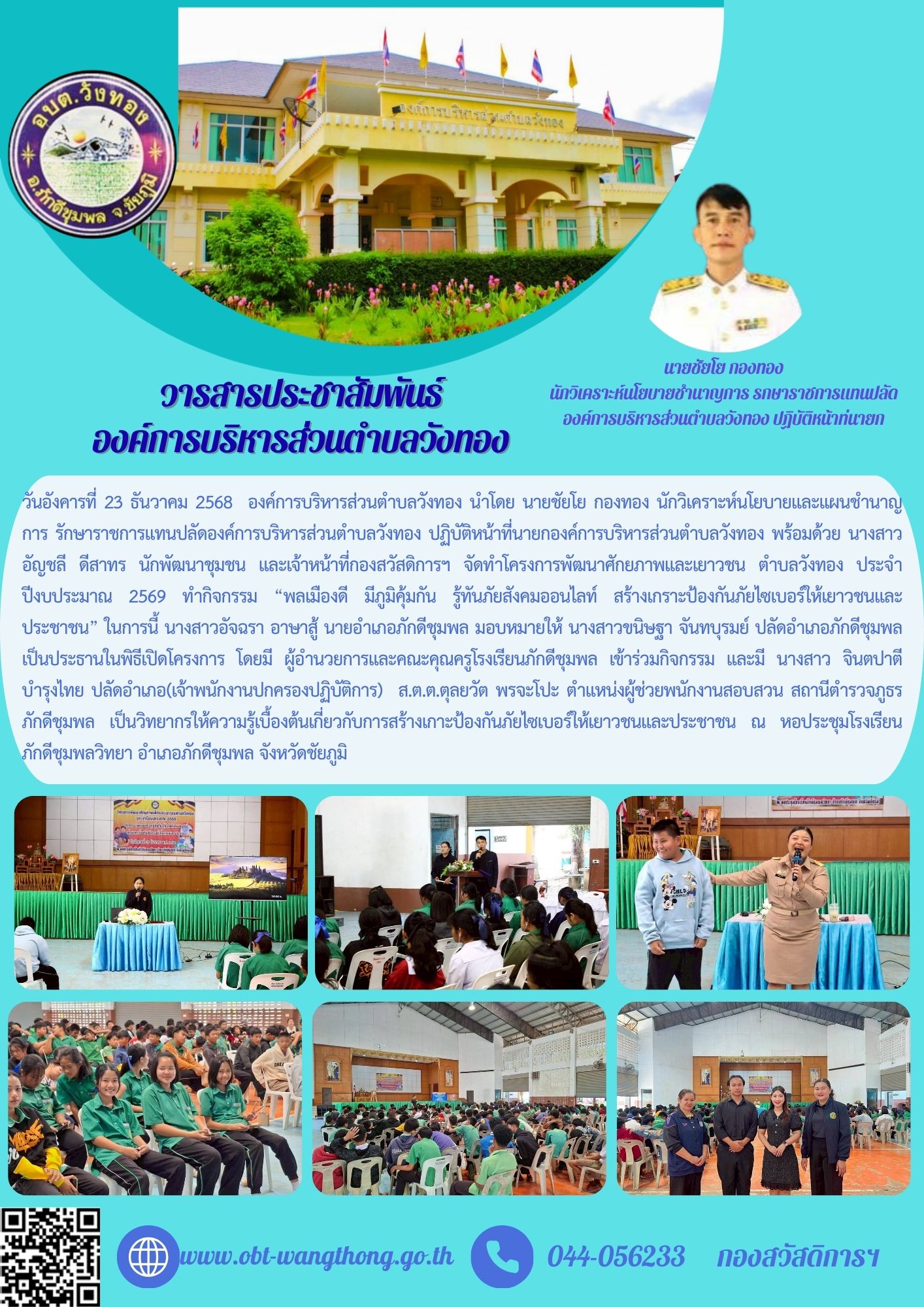 วันอังคารที่ 23 ธันวาคม 2568 องค์การบริหารส่วนตำบลวังทอง นำโดย นายชัยโย กองทอง นักวิเคราะห์นโยบายและแผนชำนาญการ รักษาราชการแทนปลัดองค์การบริหารส่วนตำบลวังทอง ปฏิบัติหน้าที่นายกองค์การบริหารส่วนตำบลวั