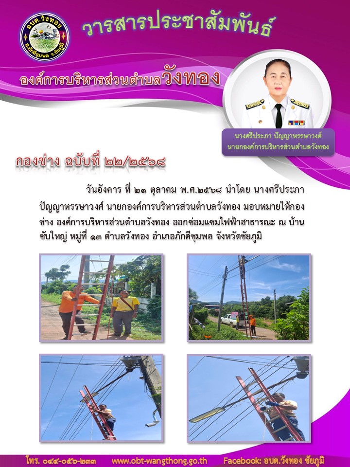 วันอังคาร ที่ 21 ตุลาคม พ.ศ.2568 นำโดย นางศรีประภา ปัญญาหรรษาวงศ์ นายกองค์การบริหารส่วนตำบลวังทอง มอบหมายให้กองช่าง องค์การบริหารส่วนตำบลวังทอง ออกซ่อมแซมไฟฟ้าสาธารณะ ณ บ้านซับใหญ่ หมู่ที่ 13 ตำบลวังท