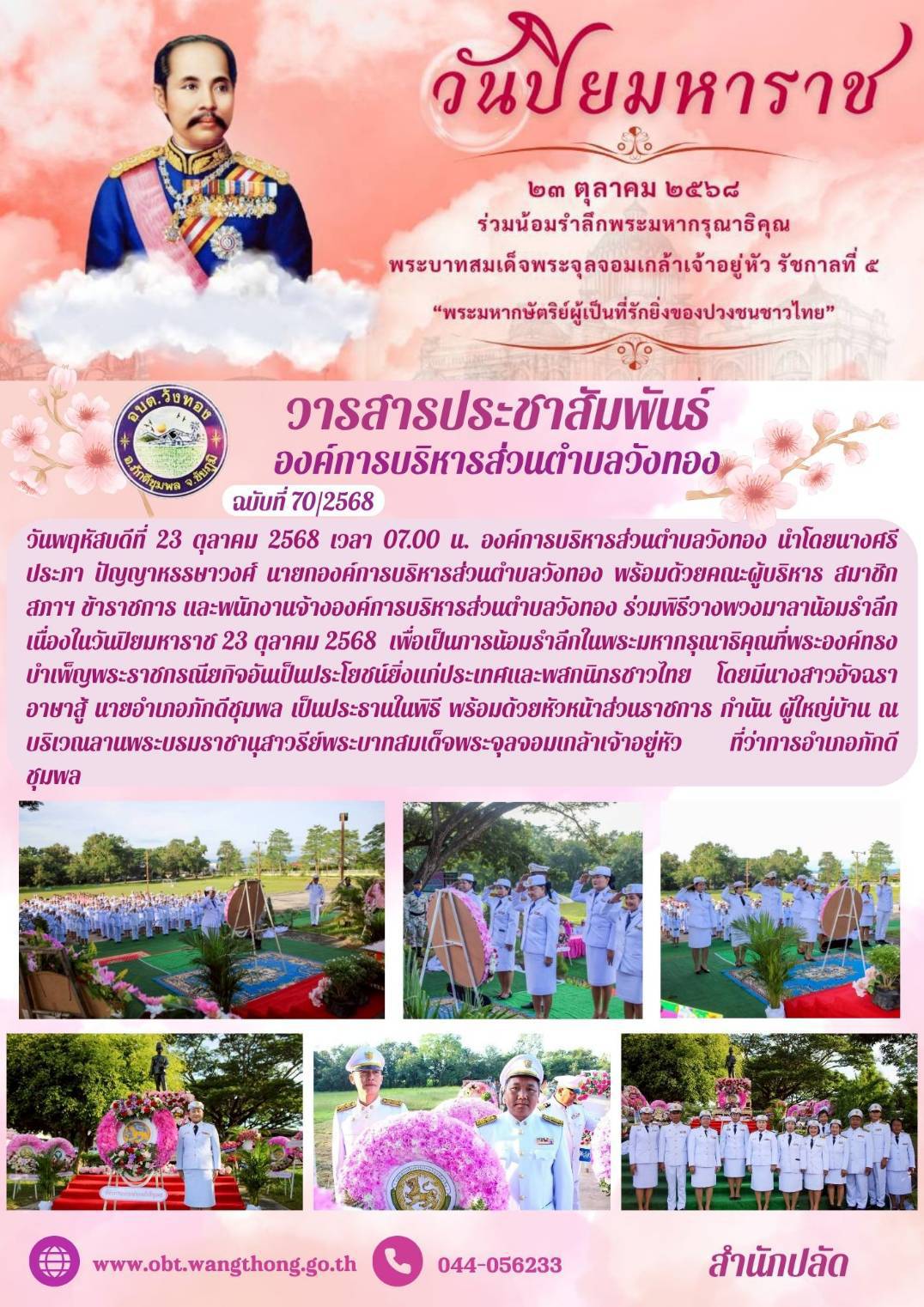 วันพฤหัสบดีที่ 23 ตุลาคม 2568 เวลา 07.00 น. องค์การบริหารส่วนตำบลวังทอง นำโดยนางศรีประภา ปัญญาหรรษาวงศ์ นายกองค์การบริหารส่วนตำบลวังทอง พร้อมด้วยคณะผู้บริหาร สมาชิกสภาฯ ข้าราชการ และพนักงานจ้างองค์การ