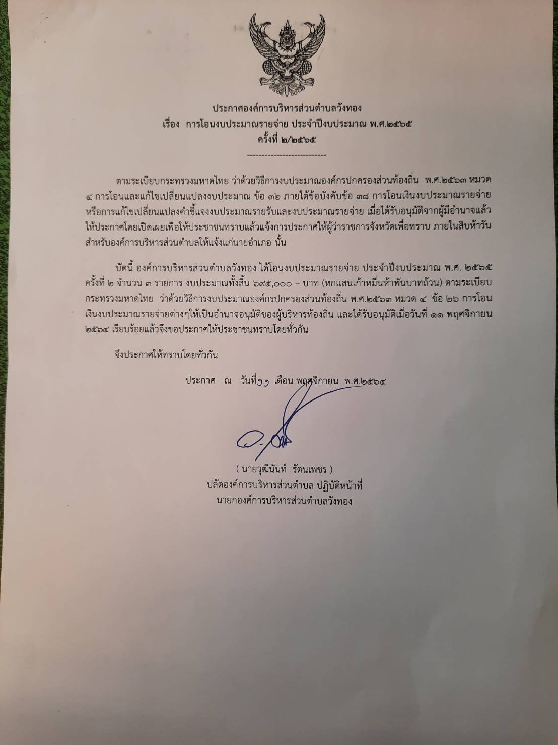 ประกาศสภาองค์การบริหารส่วนตำบลวังทอง เรื่องแต่งตั้งคณะกรรมการแปรญัตติร่างข้อบัญญัติงบประมาณรายจ่าย ประจำปีงบประมาณ พ.ศ. 2565 |